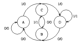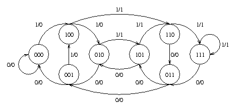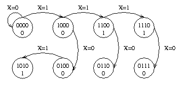 Assume a Machine called M1, which is a single-input single-output SSC whichdetermines whether or not the previous 4 bits constituted a valid BCD codeword. Output z=0 indicates a valid word, output z=1 indicates an invalid BCD word. Z is normally 0, and is only high when the invalid word is detected. The least significant digit appears first in time. On each clock, a new X is presented and the oldest previous value of X is discarded.
